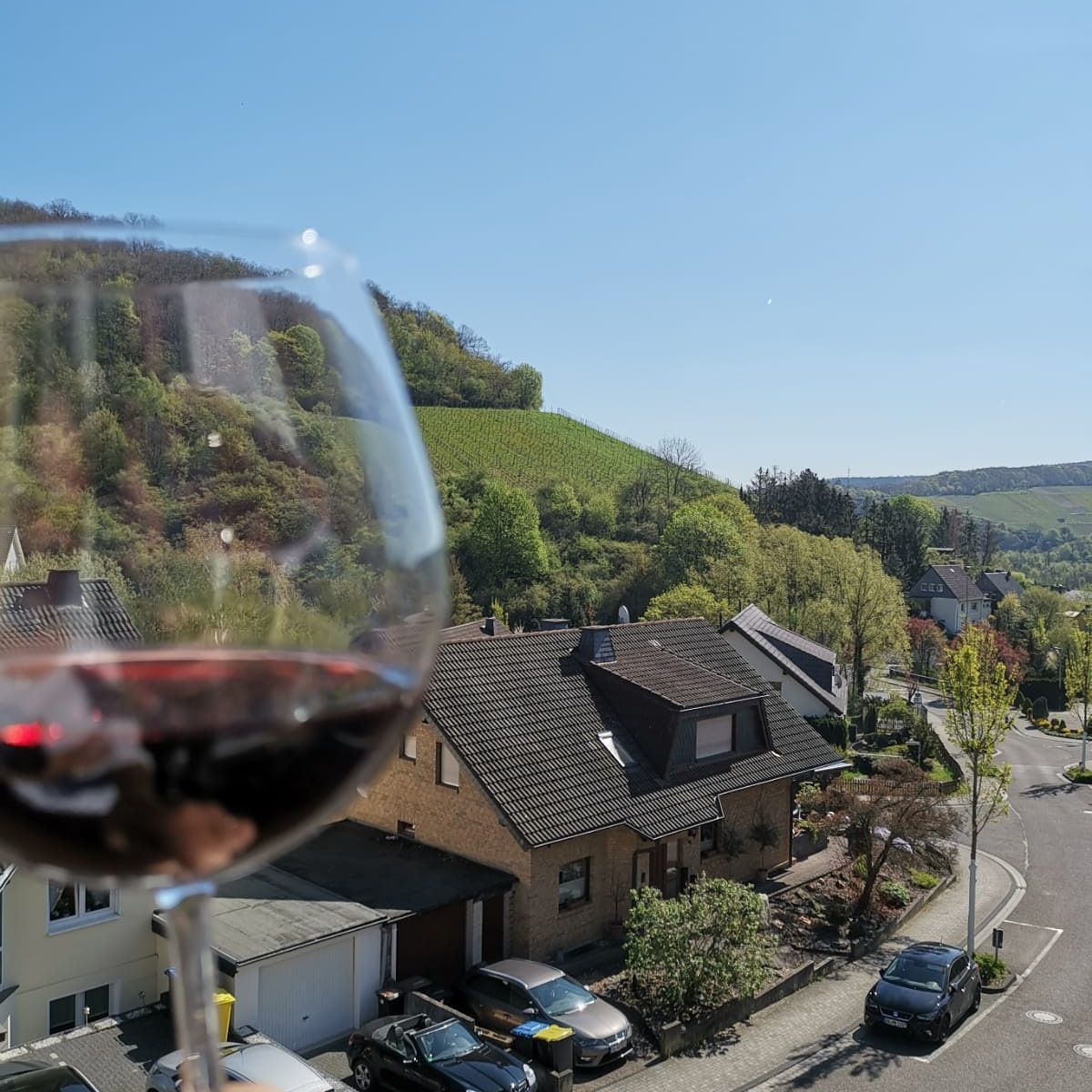 Grande façade à pignon, baie vitrée et deux balcons offrant une vue fantastique sur les vignes et la forêt.